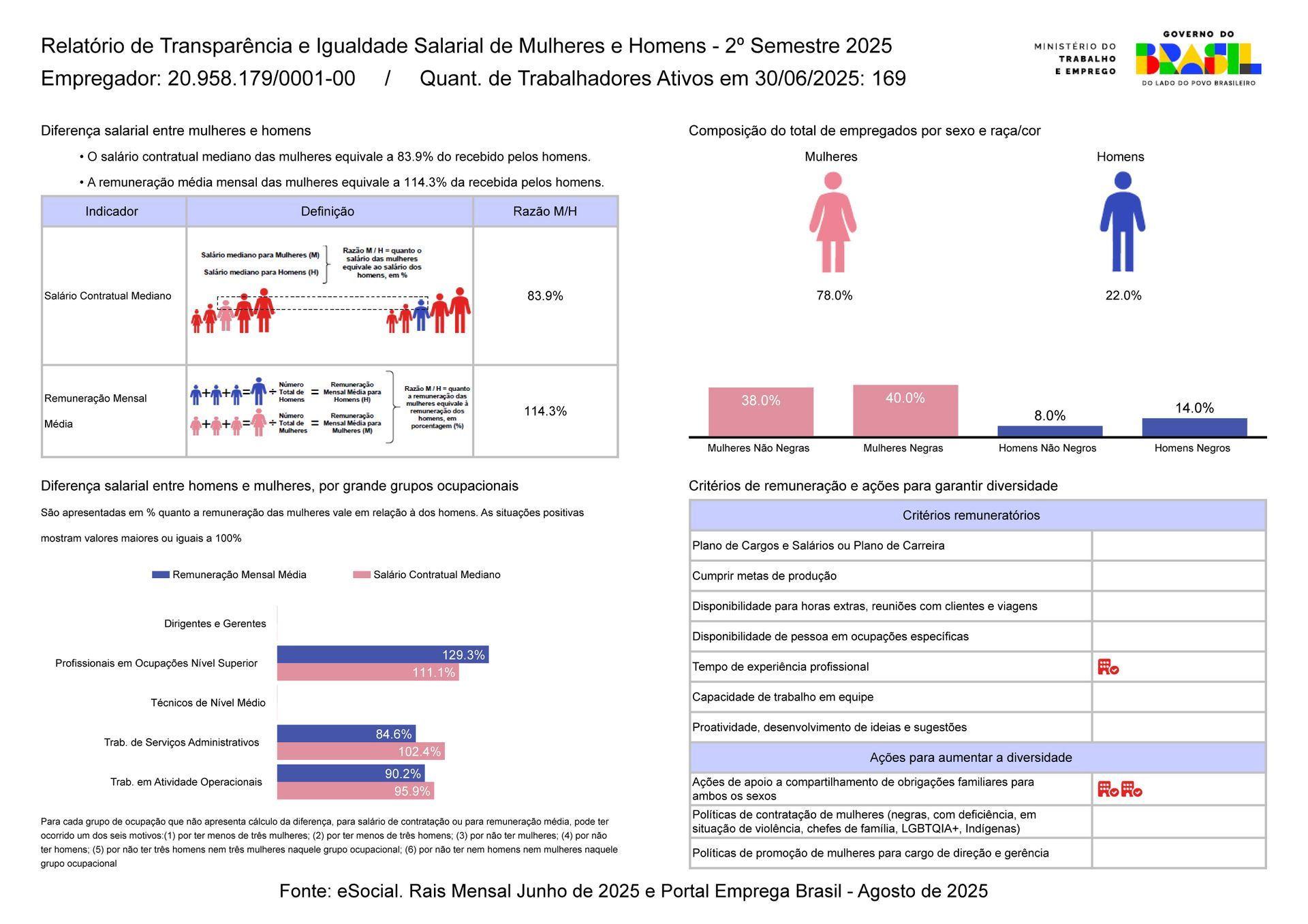 Em cumprimento às disposições do art. 14 da Instrução Normativa GM/MTE N° 6 de 17 de setembro de 2024, que trata da divulgação do Relatório de Transparência Salarial e de critérios remuneratórios entre mulheres e homens. informamos que o Ministério do Trabalho e Emprego - MTE disponibilizou o documento (relatório final) no Portal Emprega Brasil para o download e posterior publicização nos web sites redes sociais ou instrumentos similares das empresas.